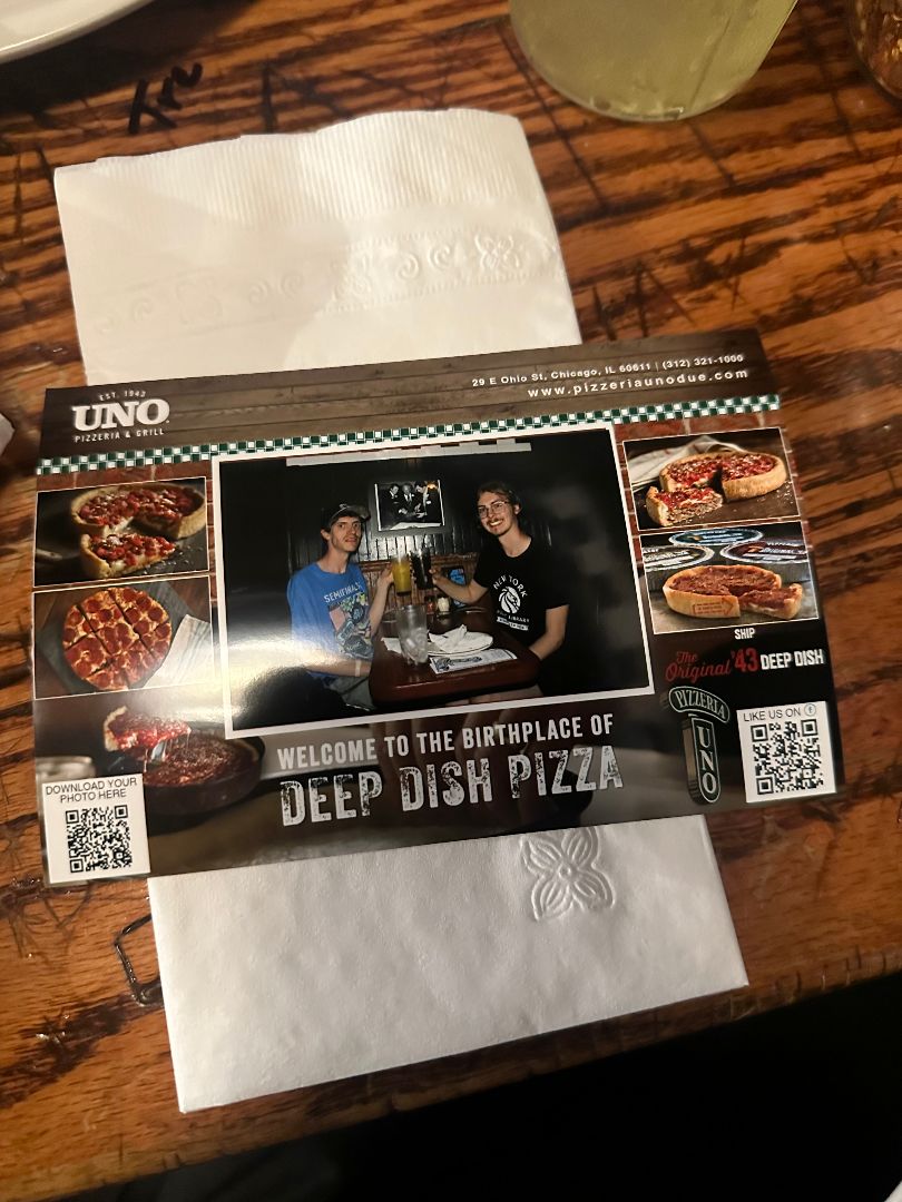 We finally got our pizza, which was pretty small all things considered, but it’s a lot thicker than normal pizza so it kind of makes sense. The waiter said it was very hot, so she would cut the first slices for us, and she cut it into four pieces and gave us each one. After waiting a bit for it to cool down, we dove in. This might be a controversial statement, but I think I much prefer classic pizza over deep dish pizza. The first few bites were good, It was thick with sauce, toppings, and dough, had a great mixture between them, and was very tasty. After that, it got a little less tasty because it strangely had a pretty overwhelming taste of red wine the closer to the crust I got. It ran out of toppings, and was mostly just sauce with the aforementioned wine taste. I would definitely try it again at another restaurant though, as I don’t want to rule out the whole dish based on one experience. We also got our photo back while we were eating, in which Kyle looks a little scary.