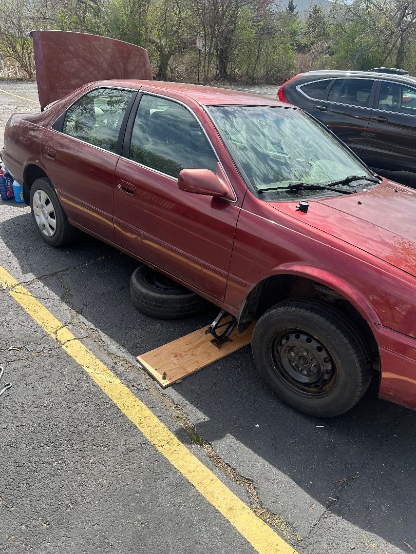 While today is still another day of waiting, it’s also car repair day! John’s neighbour was a bit hard to get ahold of, and being a mechanic he also likely didn’t really want to look at the car after a full day of working on cars (he didn’t say this, but we can presume). Though, despite his broken leg, John was happy to try and take a look for us himself. We took the car for a loop around the apartment to show him the noise, which was definitely still present, before taking off the front left tire and getting under the car to take a look.