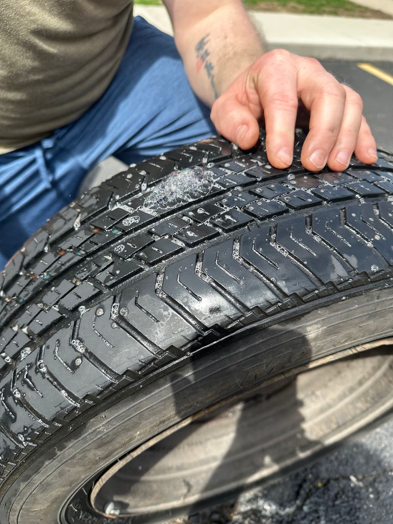 The consensus in the end was that it was a worn out control arm bushing causing the clunking noise. While not an urgent repair, and definitely still drivable, if it got any worse we’d definitely want to have it looked at. At the same time we also looked at the problematic tire and found the leak using soap and water. It’s a small leak on the outside, definitely fixable, but rather than spending money on that we just threw on the full-size spare tire which holds air no problem. The leaky tire is now our spare tire, which despite the leak is still good as a temporary spare should we need it.