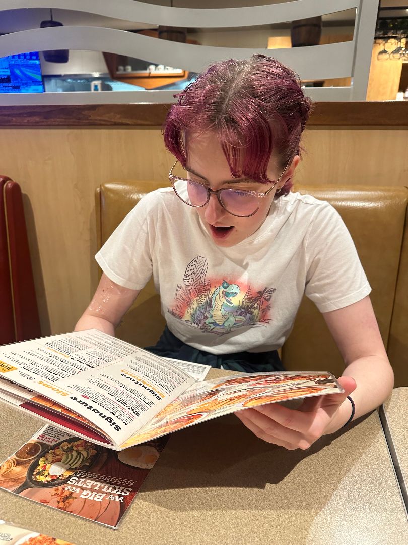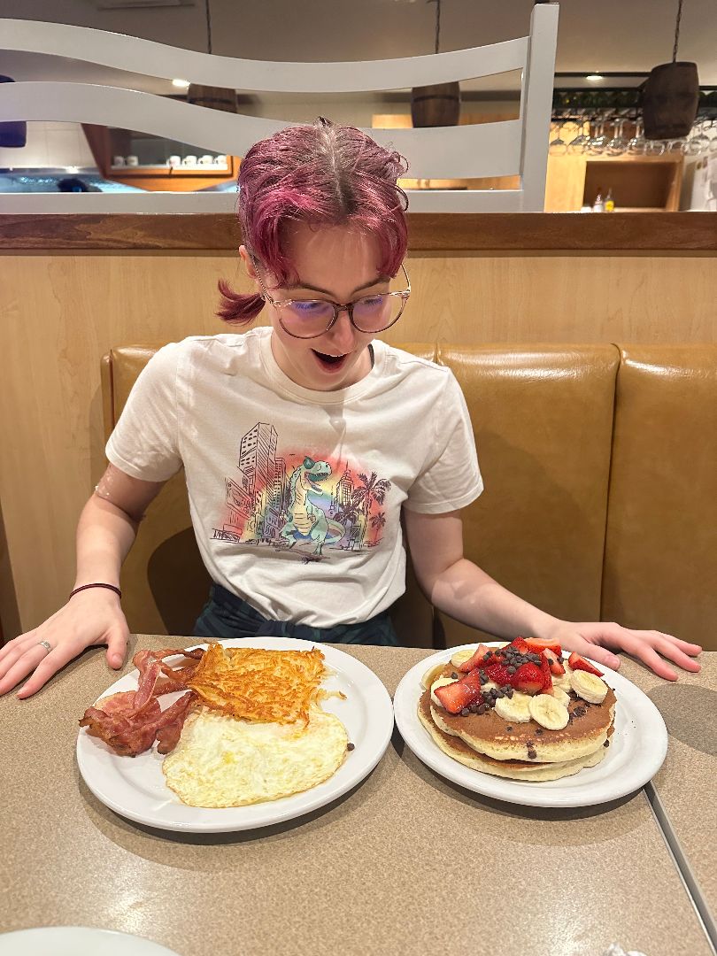We woke up pretty late today, around 10 or 11, since we were quite tired from last night. After a slow morning we decided to head to a Denny’s downtown, since Sophia had never been, despite seeing it in shows and such so often. She was absolutely flabbergasted by Denny’s and had a great time, and her socks were quote, “knocked so far off they were on the street”. We spent about an hour at Denny’s enjoying our breakfast and chatting, before heading back on to the street.