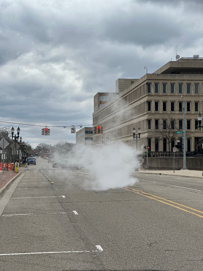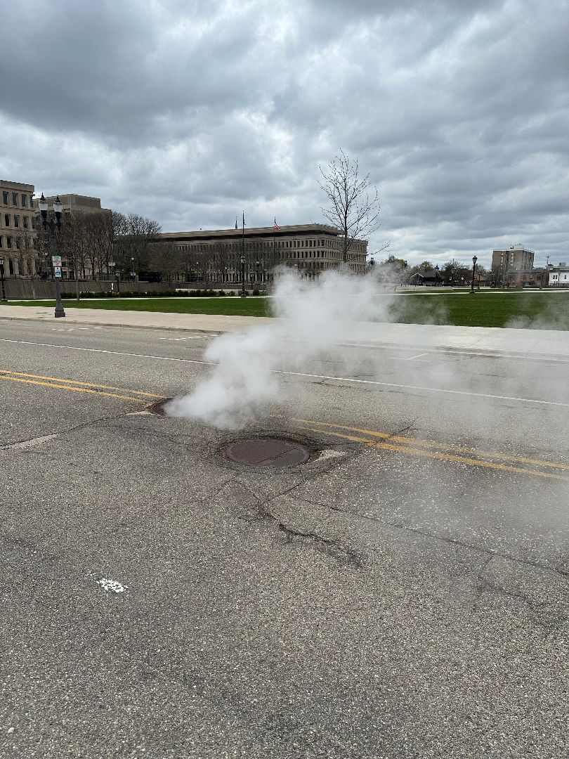 We woke up pretty late, given our late night last night, and got going around 1pm. We drove right to Lancing, the capital of Michigan, and went to get our photo. We noticed that some of the manhole covers downtown were steaming pretty excessively, which turns out to be because they use steam-based heating in some of their buildings downtown, similar to how New York City does it (that’s why you see steam rising there as well).