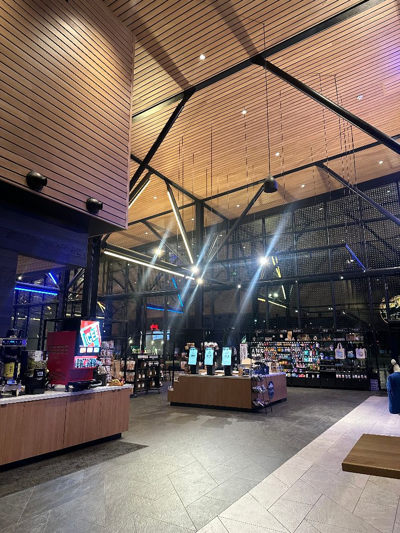 A short bit later we stopped at “Travel Plaza” (like a rest area but fancier and I believe privately owned) to use the bathroom. This building was super, super nice, especially for a remote rest area. The ceilings were super tall, it was clean, warm, and there was a giant LED wall on the outside of the building. They also had internet! While we were, the rain started to fall outside, and we knew what was coming, but got back on the road to finish the last hour to the rest area we were going to sleep at for the night.