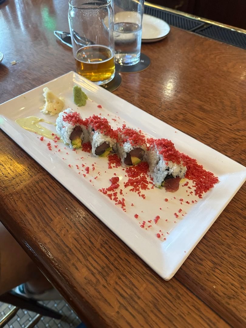 We walked a few minutes to a metro station where we took it back downtown and then had another short walk to the bar. It definitely looks and feels like an upmarket place, being situated in an old looking building with very tall ceilings. We took a seat at the bar and started watching the hockey game before Jackson ordered a beer and I ordered a milkshake. The bartender had to figure out how to place an order for a milkshake as she doesn’t usually get orders for milkshakes at the bar, but she found it fun. We also ordered a plate of sushi to share, which was quite reasonably priced due to it being happy hour. Our bills ended up being exactly the same even though we ordered different things, so that was neat.